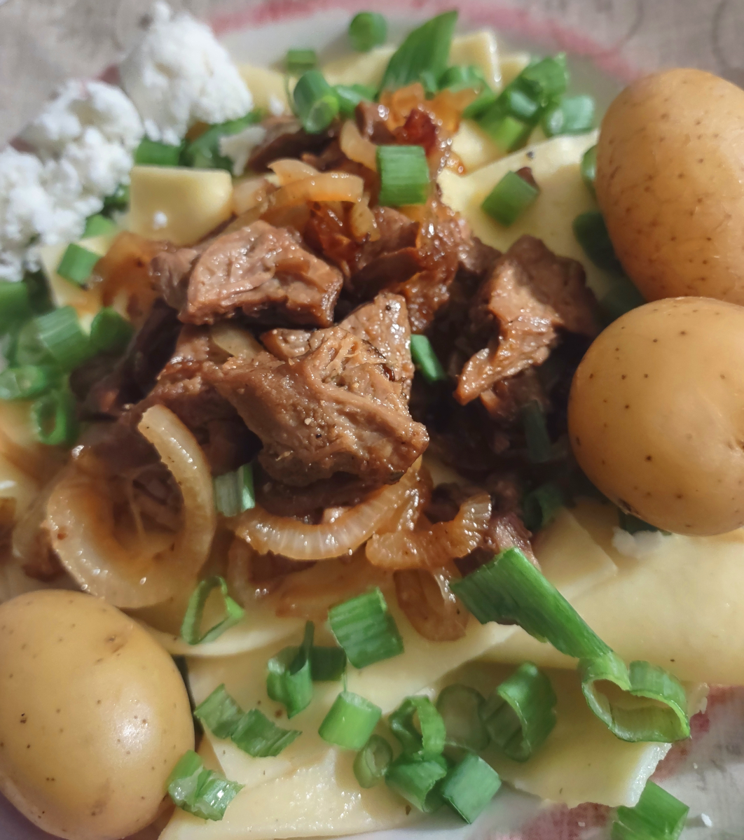 Beshbarmak: Wide noodles served with (horse) meat, potato, onion, and cheese in a mild beef broth.
