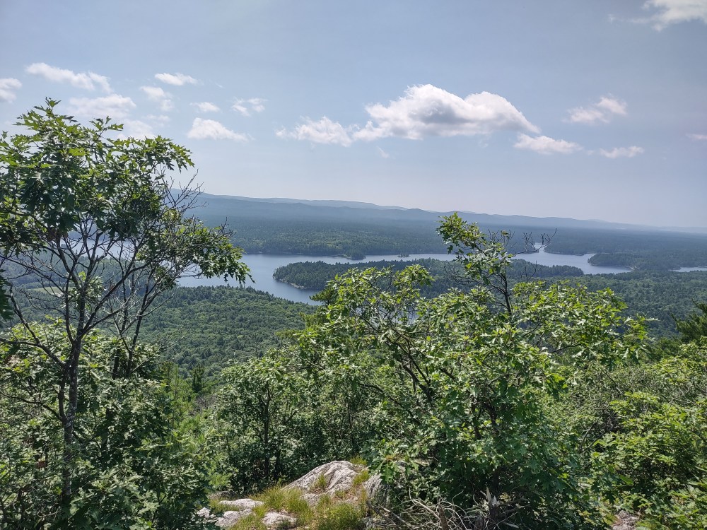 The trail took us through the woods and over a little bridge, then up onto a quartzite mound covered with blueberries. There, we lost the trail. For an hour, we staggered around, not thinking to take off our packs, trying to find the trail again. The blueberries stuffed into our mouths at regular intervals were the only silver lining in an otherwise frustrating and sweaty hour. We finally located the trail near to where we had lost it. It was a lesson learned: Stop. Look at the map. Take off our bags. Find the trail.