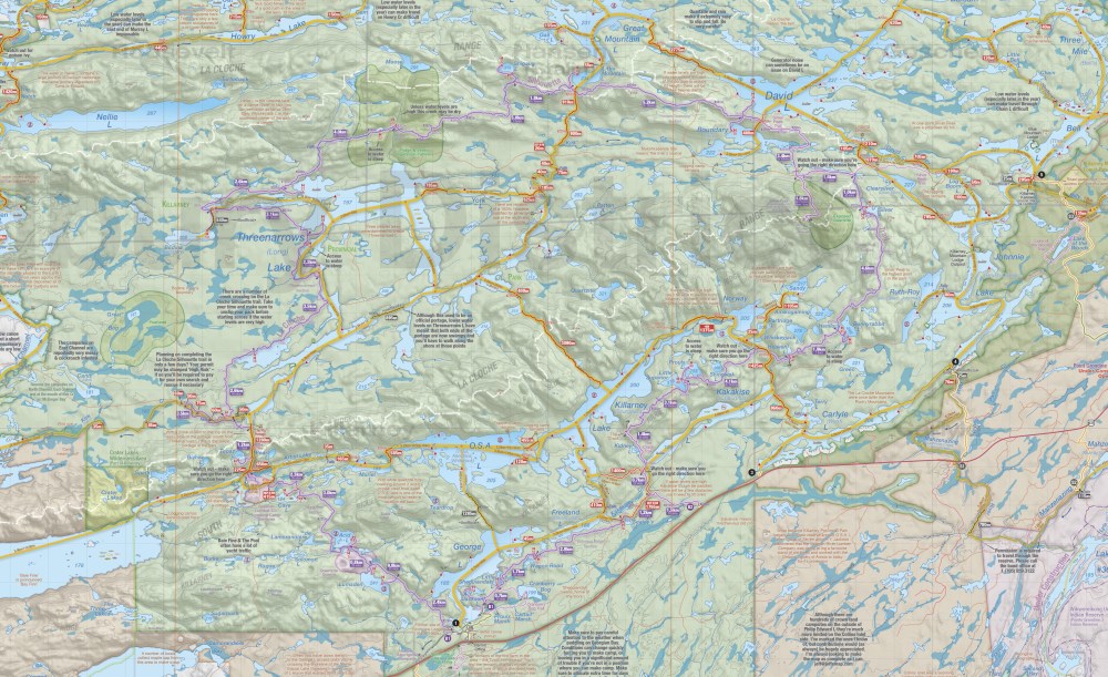 I chose the dates (end of July 2025, nine days hiking with one rest day in the middle) and started researching. I quickly came across Jeff’s Map — a fantastically detailed map of Killarney for both paddlers and hikers with helpful hints (“access to water steep” and “watch out – make sure you go the right direction here”) and distances. The map estimated the time to get from site to site along the Silhouette route (30+ backcountry sites are interspersed along the trail). I zoomed into the map to capture just the Silhouette, and took the file to be printed. If I had read the map more thoroughly before cropping it, I might have seen the disclaimer on the right side that advised that inexperienced backpackers should double the estimated travel times.