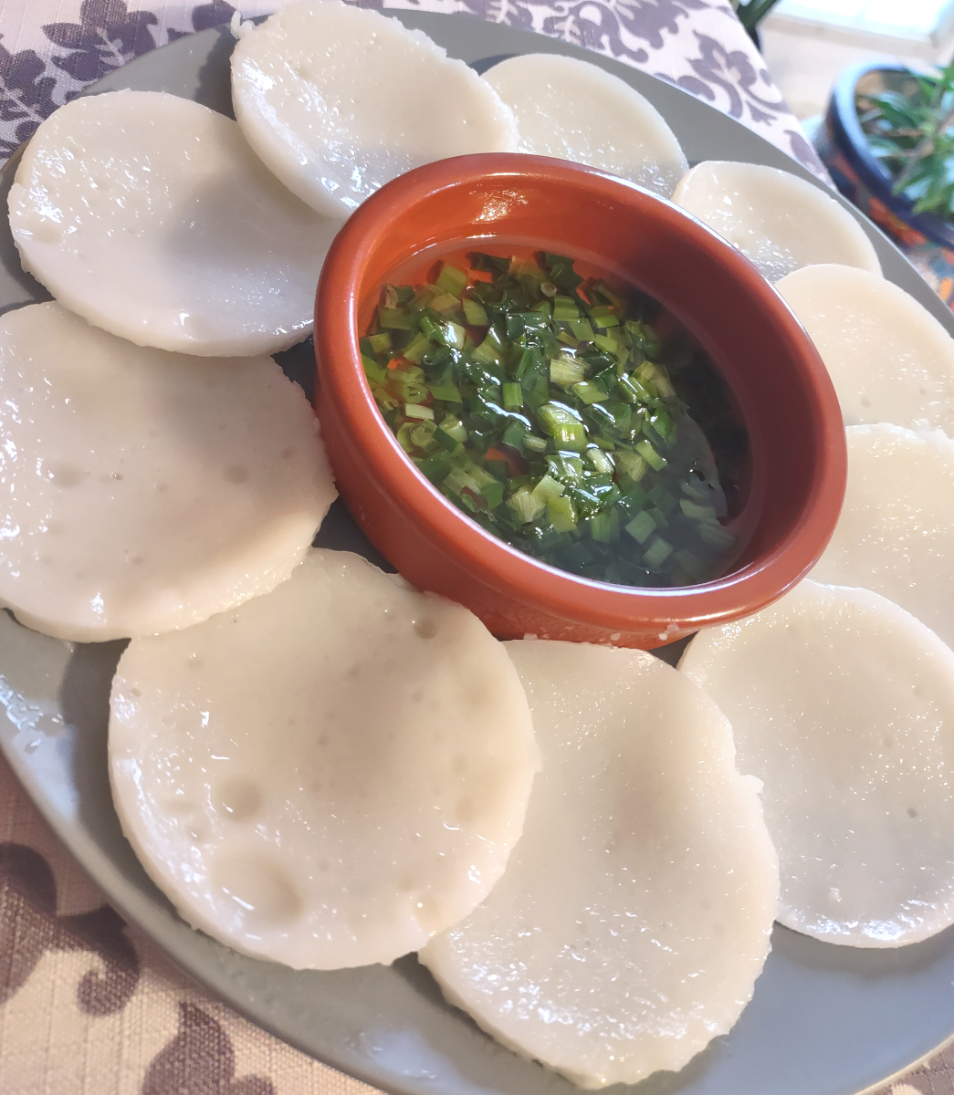 Bánh bèo mặn (Rice Pancakes): Thin rice pancakes served with green onion oil and chili sauce. I remember eating these in a rooftop cafe in Ho Chi Minh, and when I got this assignment I went looking for the recipe.