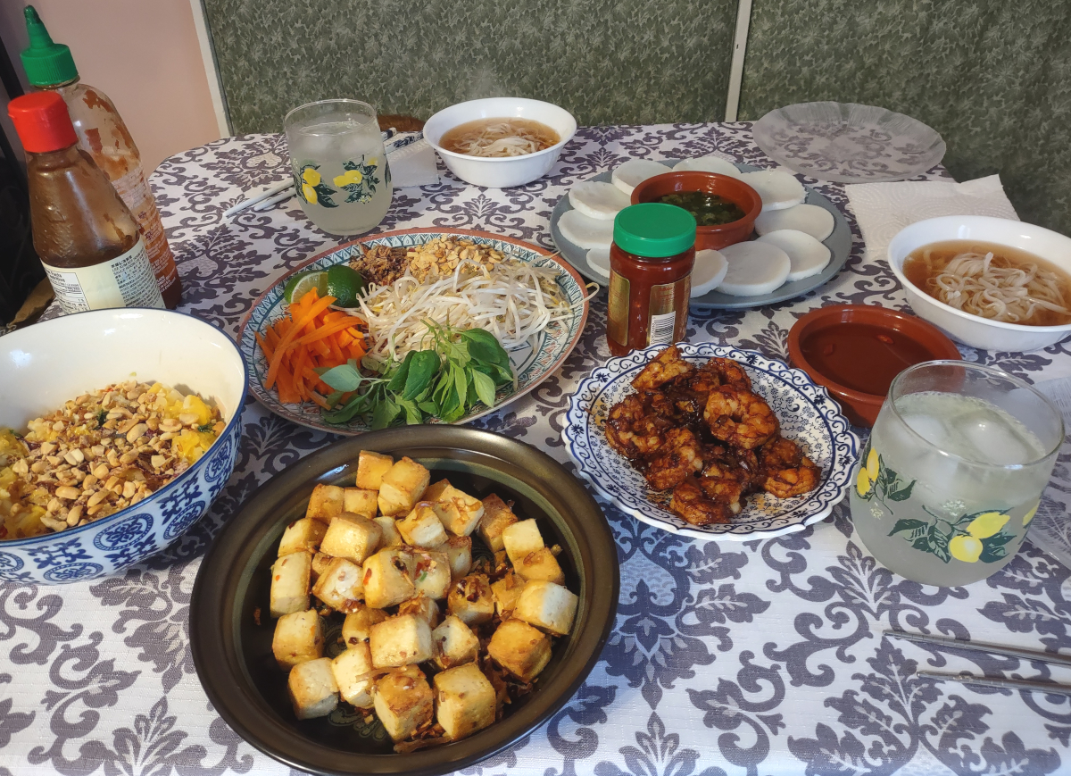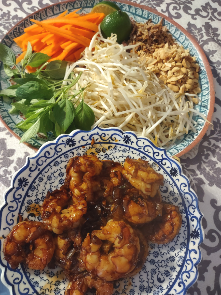 Shrimp Phở: A versatile aromatic soup central to the Vietnamese culinary experience. This version of phở had shrimp, rice noodles, carrot, beansprouts, basil, peanuts, sriracha, and hoisin sauce.